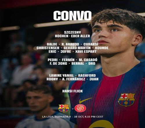 雷速体育10月18日宣 巴塞罗那俱乐部官方公布了本轮西甲主场对阵赫罗纳的球员名单,亚马尔和费尔明榜上有名、复出在即。
